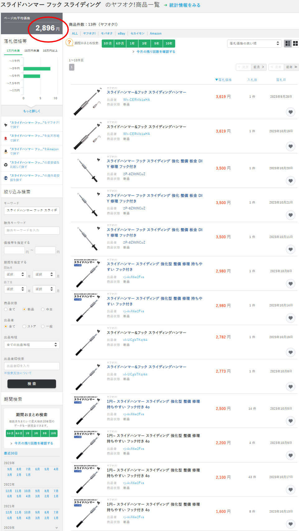 平均落札価格2,896円で平均送料は615円なので合計平均落札価格3,511円です。