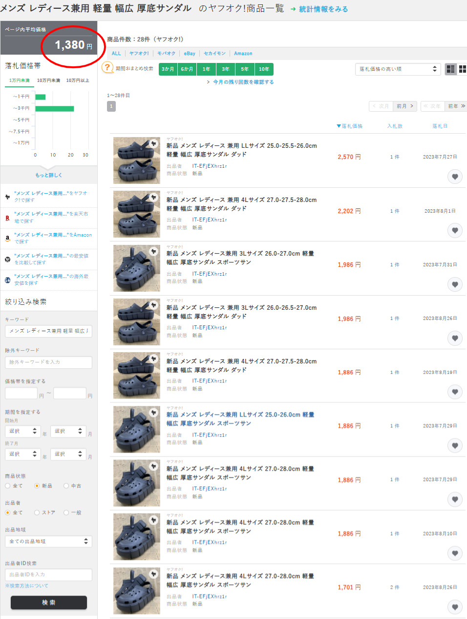 28件の落札で平均落札価格1,380円で送料一律1,000円なので合計平均落札価格2,380円です。