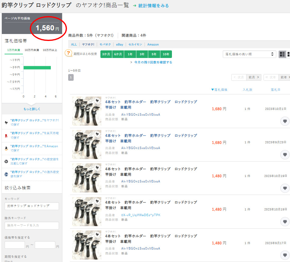 4個セットで平均落札価格1,560円、送料無料です。