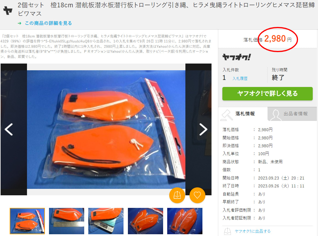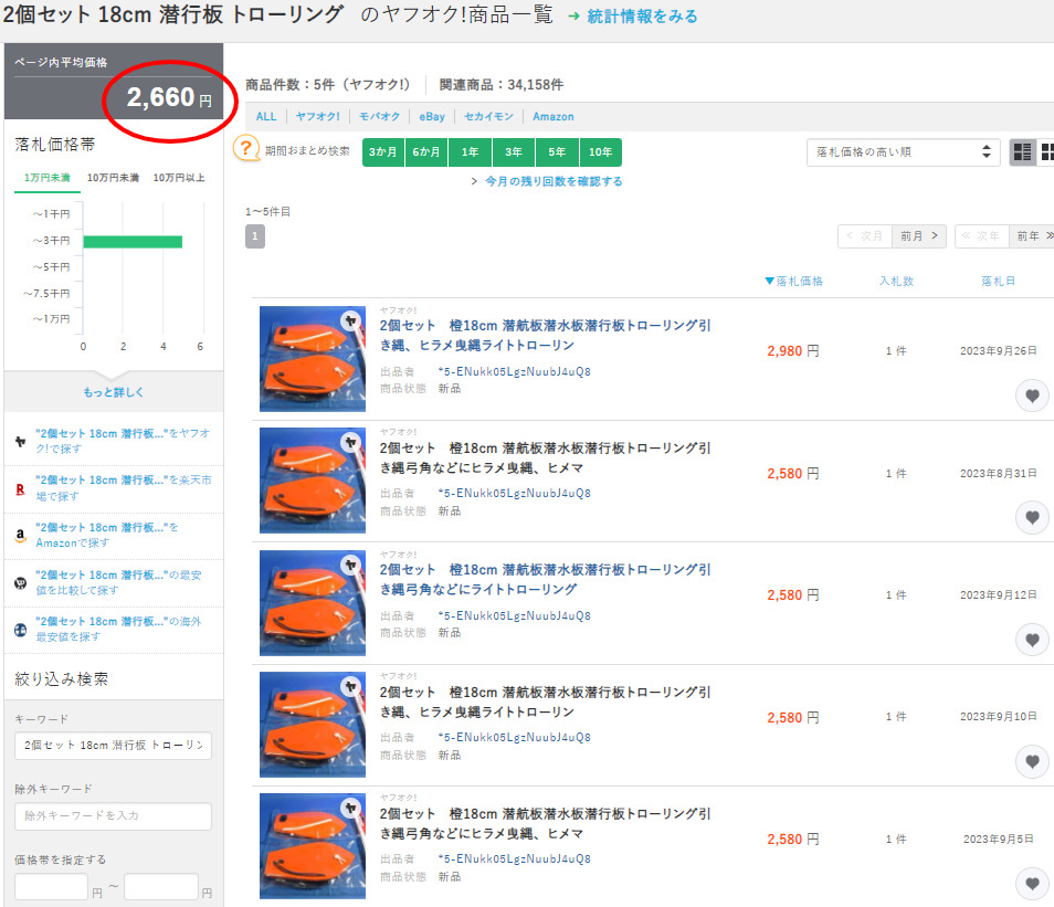 平均落札価格2,660円で送料は一律520円なので合計平均落札価格は3,180円です。